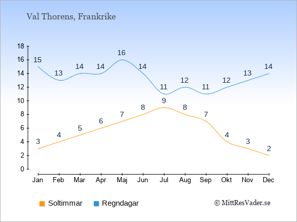 Grafen visar det genomsnittliga antalet soltimmar i Val Thorens under en viss månad (soltimmar är det antalet timmar per dag där solen skinnar), och antalet regndagar (dvs. det genomsnittliga antalet dagar