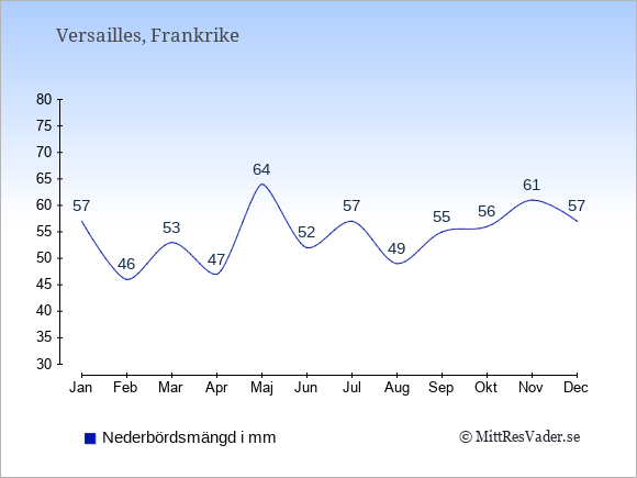 För att se hur vädret i Versailles skiljer sig från vädret hemma, kan du också jämföra siffrorna måned för måned med motsvarande siffror för Sverige under samma period här: Versailles klimat.