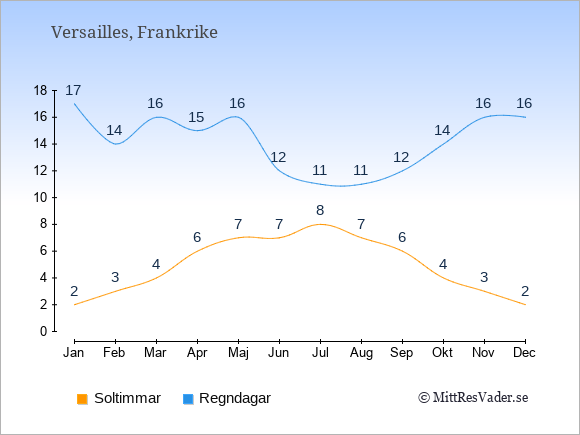 Grafen visar det genomsnittliga antalet soltimmar i Versailles under en viss månad (soltimmar är det antalet timmar per dag där solen skinnar), och antalet regndagar (dvs. det genomsnittliga antalet dagar