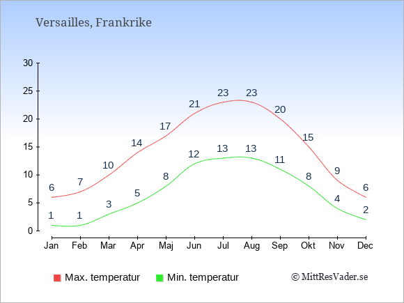 Grafen visar de genomsnittligt högsta temperaturerna i Versailles (vanligtvis det värde som uppmätts mitt på dagen) och de genomsnittligt lägsta temperaturer (vanligtvis tidpunkten just innan soluppgång).