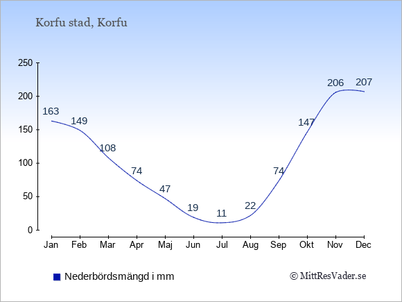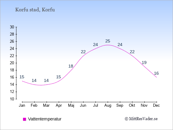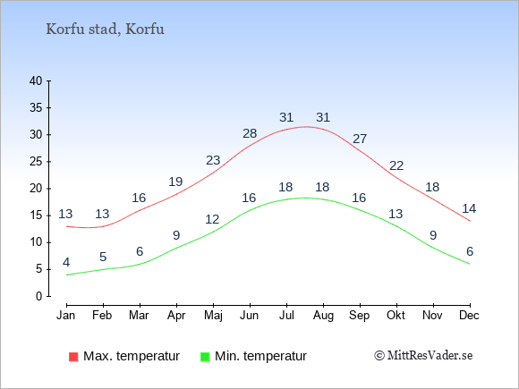 På denna sida kan du få en överblick över de statistiska klimatuppgifterna för Korfu stad månad för månad jämfört med klimatet i Stockholm. Information om det historiska klimatet kan du använda för att planera din semester och hitta den bästa tiden att resa till Korfu stad på.