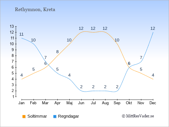 Graferna visar det genomsnittliga antalet soltimmar i Rethymnon per dag