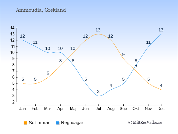 Grafen visar det genomsnittliga antalet soltimmar i Ammoudia under en viss månad (soltimmar är det antalet timmar per dag där solen skinnar), och antalet regndagar (dvs. det genomsnittliga antalet dagar