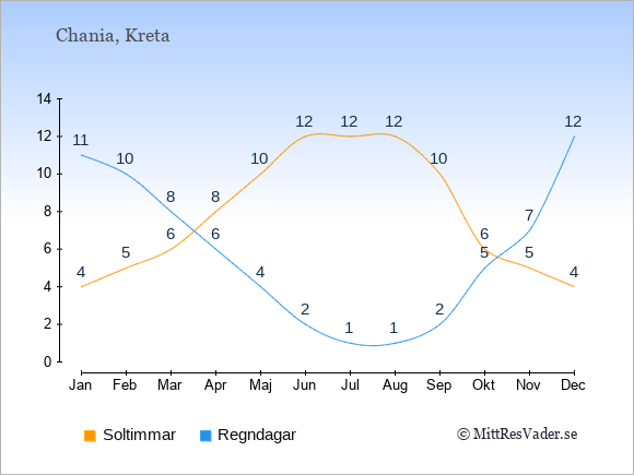 Grafen visar det genomsnittliga antalet soltimmar i Chania under en viss månad (soltimmar är det antalet timmar per dag där solen skinnar), och antalet regndagar (dvs. det genomsnittliga antalet dagar