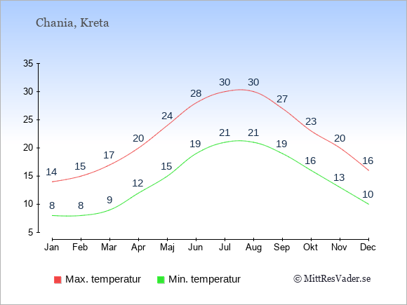 Grafen visar de genomsnittligt högsta temperaturerna i Chania (vanligtvis det värde som uppmätts mitt på dagen) och de genomsnittligt lägsta temperaturer (vanligtvis tidpunkten just innan soluppgång).