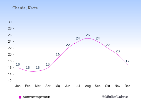 För att se hur vädret i Chania skiljer sig från vädret hemma, kan du också jämföra siffrorna måned för måned med motsvarande siffror för Sverige under samma period här: Chanias klimat.