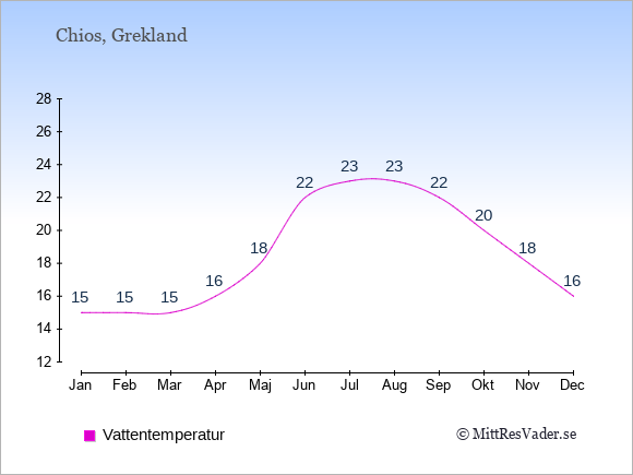 För att se hur vädret på Chios skiljer sig från vädret hemma, kan du också jämföra siffrorna måned för måned med motsvarande siffror för Sverige under samma period här: Chios klimat.