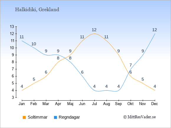 Grafen visar det genomsnittliga antalet soltimmar på Halkidiki under en viss månad (soltimmar är det antalet timmar per dag där solen skinnar), och antalet regndagar (dvs. det genomsnittliga antalet dagar