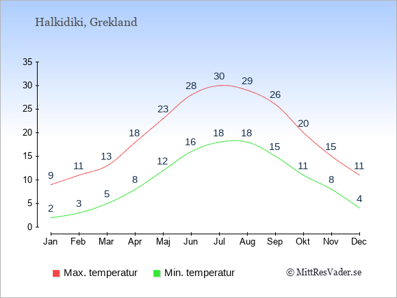 Grafen visar de genomsnittligt högsta temperaturerna på Halkidiki (vanligtvis det värde som uppmätts mitt på dagen) och de genomsnittligt lägsta temperaturer (vanligtvis tidpunkten just innan soluppgång).