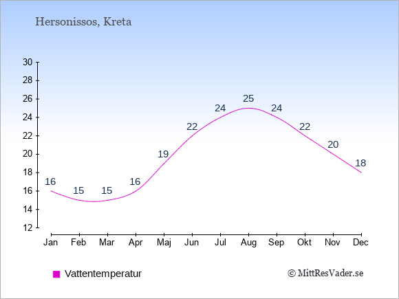 Få en överblick över vädret i Hersonissos månad för månad med temperaturer, vattentemperatur, soltimmar och nederbörd.