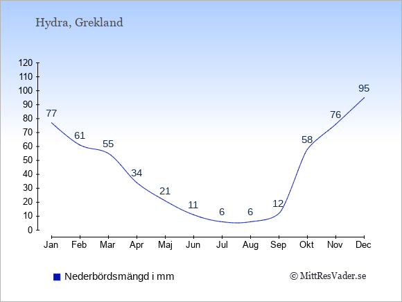 För att se hur vädret på Hydra skiljer sig från vädret hemma, kan du också jämföra siffrorna måned för måned med motsvarande siffror för Sverige under samma period här: Hydras klimat.