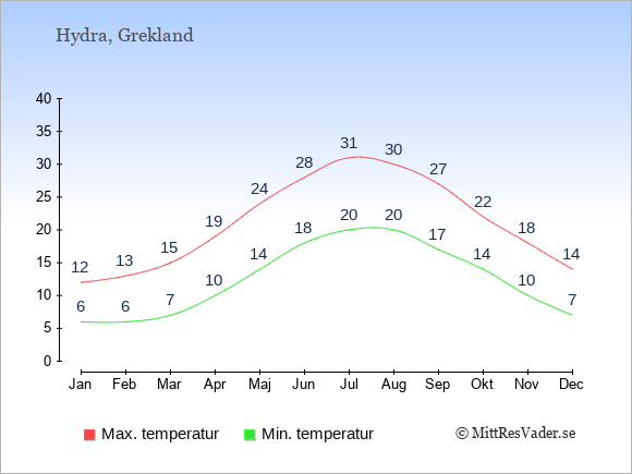 Grafen visar de genomsnittligt högsta temperaturerna på Hydra (vanligtvis det värde som uppmätts mitt på dagen) och de genomsnittligt lägsta temperaturer (vanligtvis tidpunkten just innan soluppgång).