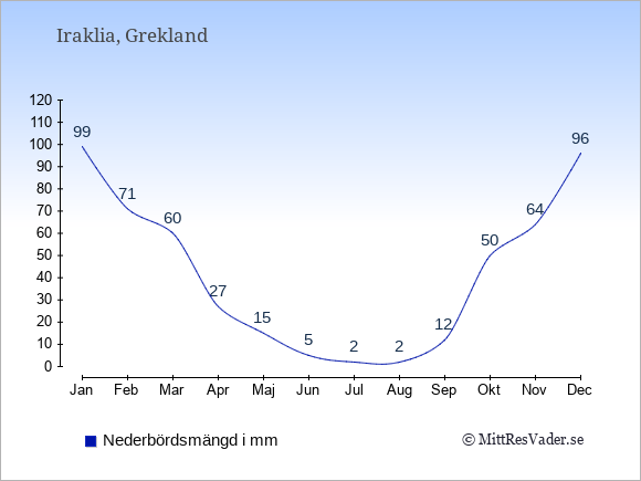 För att se hur vädret på Iraklia skiljer sig från vädret hemma, kan du också jämföra siffrorna måned för måned med motsvarande siffror för Sverige under samma period här: Iraklias klimat.