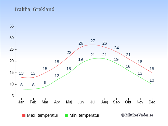 Grafen visar de genomsnittligt högsta temperaturerna på Iraklia (vanligtvis det värde som uppmätts mitt på dagen) och de genomsnittligt lägsta temperaturer (vanligtvis tidpunkten just innan soluppgång).