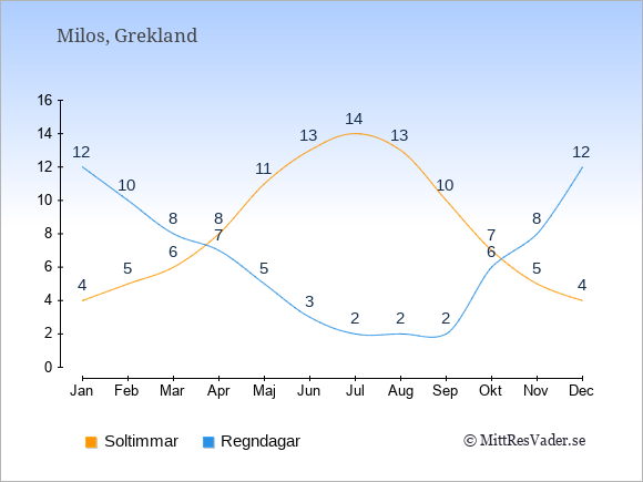 Grafen visar det genomsnittliga antalet soltimmar på Milos under en viss månad (soltimmar är det antalet timmar per dag där solen skinnar), och antalet regndagar (dvs. det genomsnittliga antalet dagar