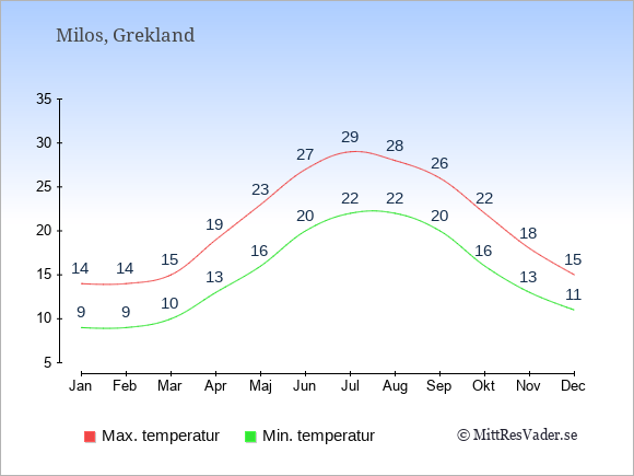 Grafen visar de genomsnittligt högsta temperaturerna på Milos (vanligtvis det värde som uppmätts mitt på dagen) och de genomsnittligt lägsta temperaturer (vanligtvis tidpunkten just innan soluppgång).