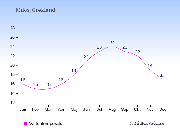 För att se hur vädret på Milos skiljer sig från vädret hemma, kan du också jämföra siffrorna måned för måned med motsvarande siffror för Sverige under samma period här: Milos klimat.