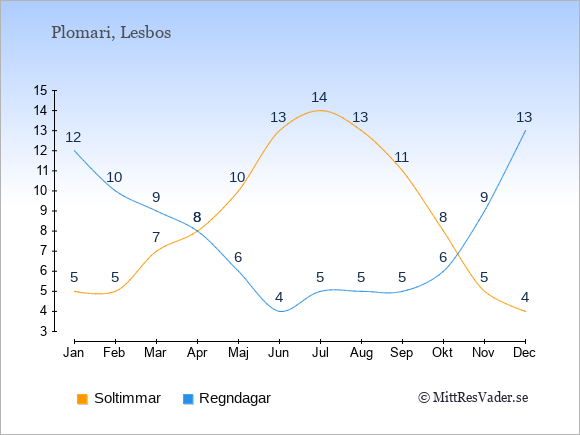 Grafen visar det genomsnittliga antalet soltimmar i Plomari under en viss månad (soltimmar är det antalet timmar per dag där solen skinnar), och antalet regndagar (dvs. det genomsnittliga antalet dagar