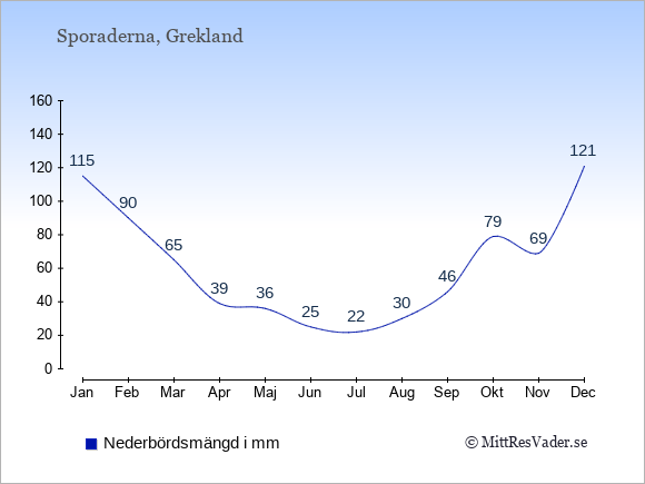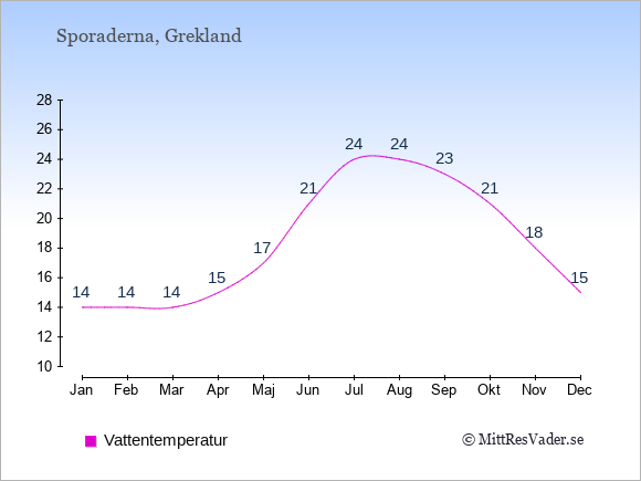 Få en överblick över vädret på Sporaderna månad för månad med temperaturer, vattentemperatur, soltimmar och nederbörd.