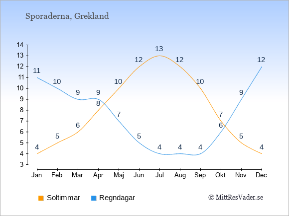 Grafen visar det genomsnittliga antalet soltimmar på Sporaderna under en viss månad (soltimmar är det antalet timmar per dag där solen skinnar), och antalet regndagar (dvs. det genomsnittliga antalet dagar