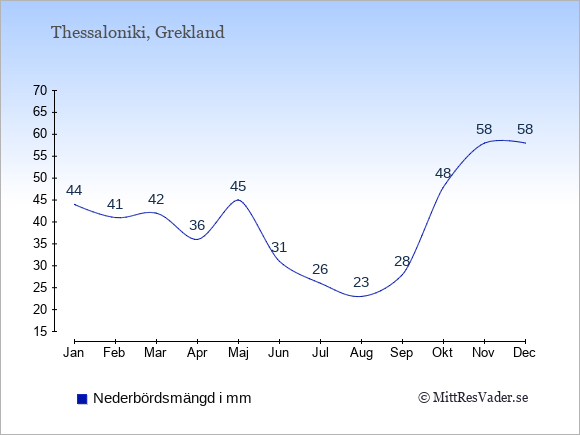 För att se hur vädret i Thessaloniki skiljer sig från vädret hemma, kan du också jämföra siffrorna måned för måned med motsvarande siffror för Sverige under samma period här: Thessalonikis klimat.