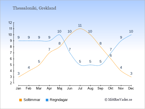 Grafen visar det genomsnittliga antalet soltimmar i Thessaloniki under en viss månad (soltimmar är det antalet timmar per dag där solen skinnar), och antalet regndagar (dvs. det genomsnittliga antalet dagar
