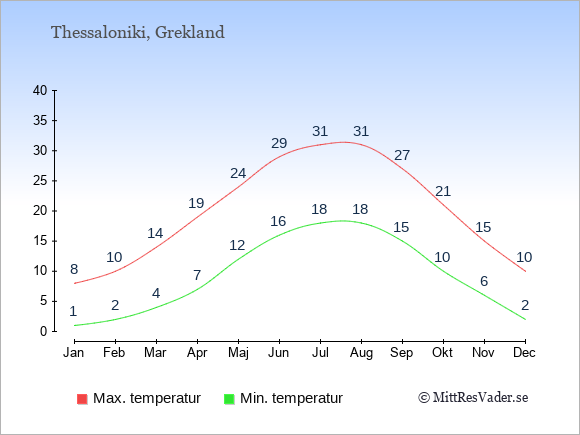 Grafen visar de genomsnittligt högsta temperaturerna i Thessaloniki (vanligtvis det värde som uppmätts mitt på dagen) och de genomsnittligt lägsta temperaturer (vanligtvis tidpunkten just innan soluppgång).