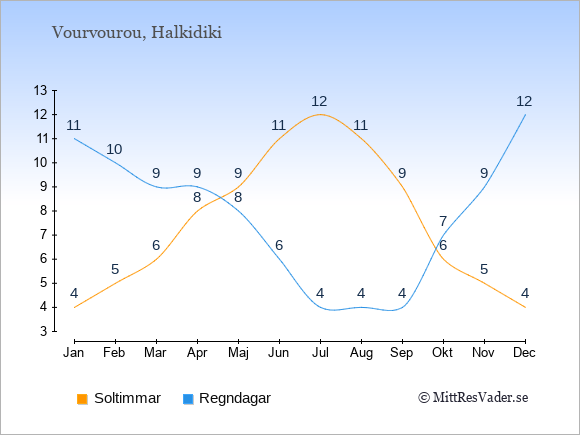 Grafen visar det genomsnittliga antalet soltimmar i Vourvourou under en viss månad (soltimmar är det antalet timmar per dag där solen skinnar), och antalet regndagar (dvs. det genomsnittliga antalet dagar