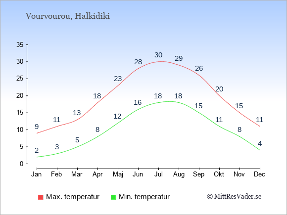 Grafen visar de genomsnittligt högsta temperaturerna i Vourvourou (vanligtvis det värde som uppmätts mitt på dagen) och de genomsnittligt lägsta temperaturer (vanligtvis tidpunkten just innan soluppgång).