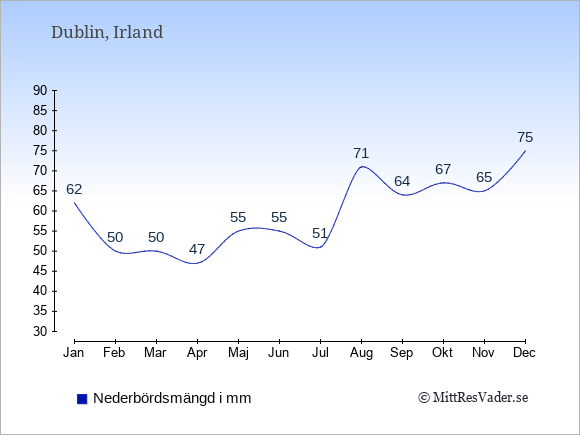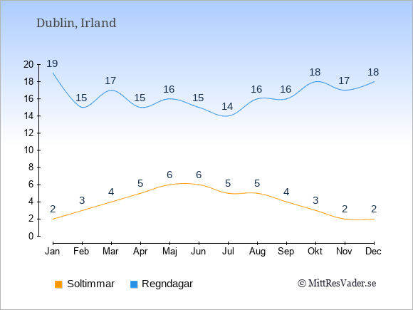 För att se hur vädret i Dublin skiljer sig från vädret hemma, kan du också jämföra siffrorna måned för måned med motsvarande siffror för Sverige under samma period här: Dublins klimat.