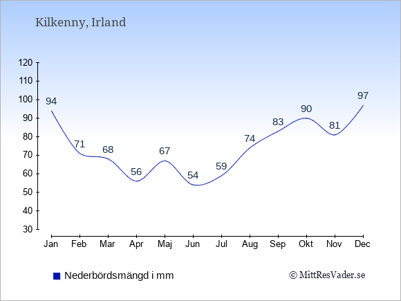 För att se hur vädret i Kilkenny skiljer sig från vädret hemma, kan du också jämföra siffrorna måned för måned med motsvarande siffror för Sverige under samma period här: Kilkennys klimat.