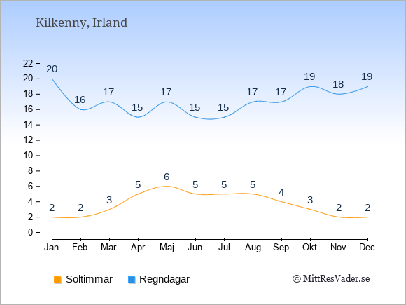 Grafen visar det genomsnittliga antalet soltimmar i Kilkenny under en viss månad (soltimmar är det antalet timmar per dag där solen skinnar), och antalet regndagar (dvs. det genomsnittliga antalet dagar