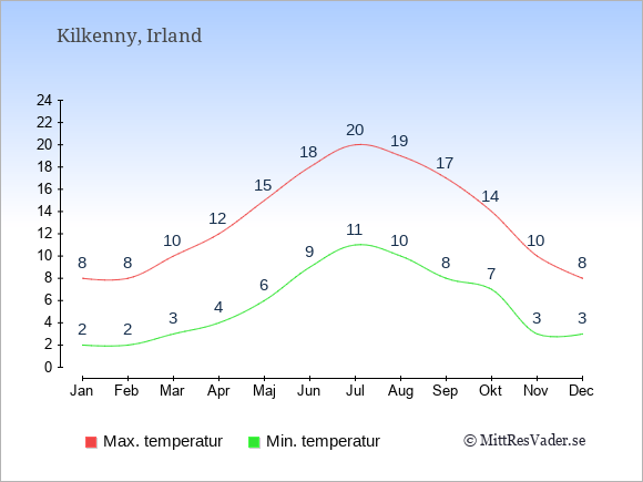 Grafen visar de genomsnittligt högsta temperaturerna i Kilkenny (vanligtvis det värde som uppmätts mitt på dagen) och de genomsnittligt lägsta temperaturer (vanligtvis tidpunkten just innan soluppgång).