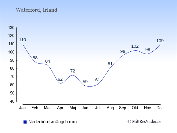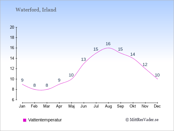 För att se hur vädret i Waterford skiljer sig från vädret hemma, kan du också jämföra siffrorna måned för måned med motsvarande siffror för Sverige under samma period här: Waterfords klimat.