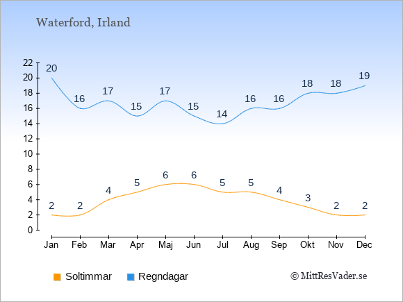 Grafen visar det genomsnittliga antalet soltimmar i Waterford under en viss månad (soltimmar är det antalet timmar per dag där solen skinnar), och antalet regndagar (dvs. det genomsnittliga antalet dagar