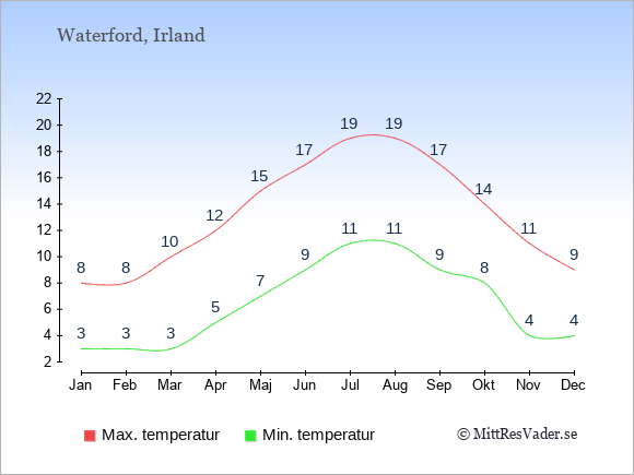 Grafen visar de genomsnittligt högsta temperaturerna i Waterford (vanligtvis det värde som uppmätts mitt på dagen) och de genomsnittligt lägsta temperaturer (vanligtvis tidpunkten just innan soluppgång).