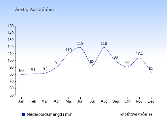 För att se hur vädret i Aosta skiljer sig från vädret hemma, kan du också jämföra siffrorna måned för måned med motsvarande siffror för Sverige under samma period här: Aostas klimat.