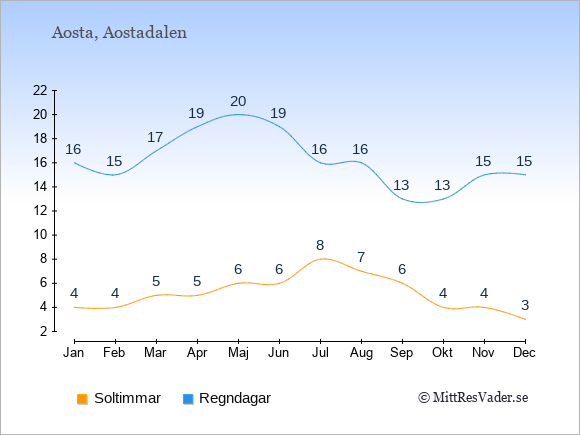 Grafen visar det genomsnittliga antalet soltimmar i Aosta under en viss månad (soltimmar är det antalet timmar per dag där solen skinnar), och antalet regndagar (dvs. det genomsnittliga antalet dagar
