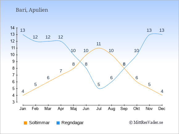 Grafen visar det genomsnittliga antalet soltimmar i Bari under en viss månad (soltimmar är det antalet timmar per dag där solen skinnar), och antalet regndagar (dvs. det genomsnittliga antalet dagar