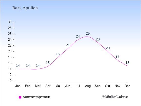 Om du vill veta hur vädret kommer att bli de kommande dagarna, kan du även se en väderprognos för Bari med den aktuella vattentemperatur just nu under: Väder Bari.