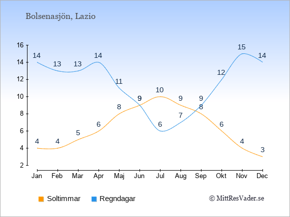 Grafen visar det genomsnittliga antalet soltimmar vid Bolsenasjön under en viss månad (soltimmar är det antalet timmar per dag där solen skinnar), och antalet regndagar (dvs. det genomsnittliga antalet dagar