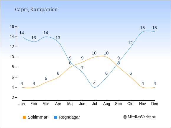 Grafen visar det genomsnittliga antalet soltimmar på Capri under en viss månad (soltimmar är det antalet timmar per dag där solen skinnar), och antalet regndagar (dvs. det genomsnittliga antalet dagar
