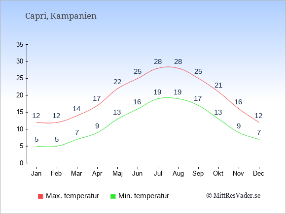 Grafen visar de genomsnittligt högsta temperaturerna på Capri (vanligtvis det värde som uppmätts mitt på dagen) och de genomsnittligt lägsta temperaturer (vanligtvis tidpunkten just innan soluppgång).