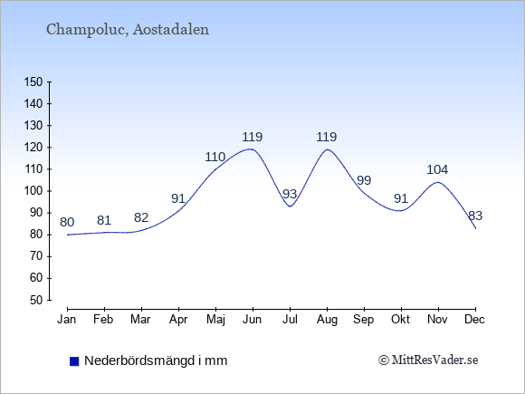 Väder i Champoluc: Soltimmar och regndagar