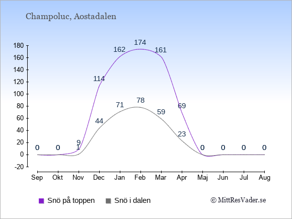 Informationen om Champolucs väder kommer från dalen. Typiskt sjunker temperaturen med cirka en grad för varje 200 meter ju högre upp du kommer i backen. Högre upp i skidområdet kan därför vara betydligt kallare än diagrammet visar.