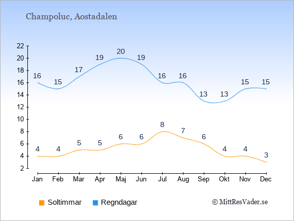 Grafen visar det genomsnittliga antalet soltimmar i Champoluc under en viss månad (soltimmar är det antalet timmar per dag där solen skinnar), och antalet regndagar (dvs. det genomsnittliga antalet dagar