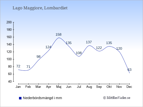 Vädret vid Lago Maggiore är oftast bäst i de månader där det finns många soltimmar och få dagars nederbörd.