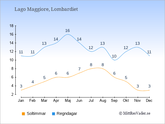 Grafen visar det genomsnittliga antalet soltimmar vid Lago Maggiore under en viss månad (soltimmar är det antalet timmar per dag där solen skinnar), och antalet regndagar (dvs. det genomsnittliga antalet dagar