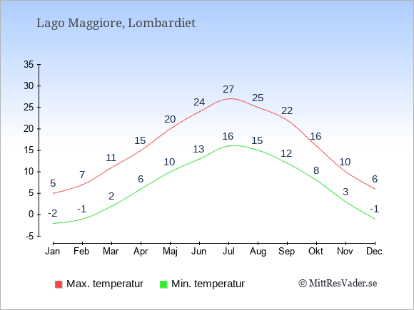 Grafen visar de genomsnittligt högsta temperaturerna vid Lago Maggiore (vanligtvis det värde som uppmätts mitt på dagen) och de genomsnittligt lägsta temperaturer (vanligtvis tidpunkten just innan soluppgång).