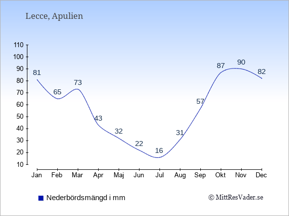 För att se hur vädret i Lecce skiljer sig från vädret hemma, kan du också jämföra siffrorna måned för måned med motsvarande siffror för Sverige under samma period här: Lecces klimat.